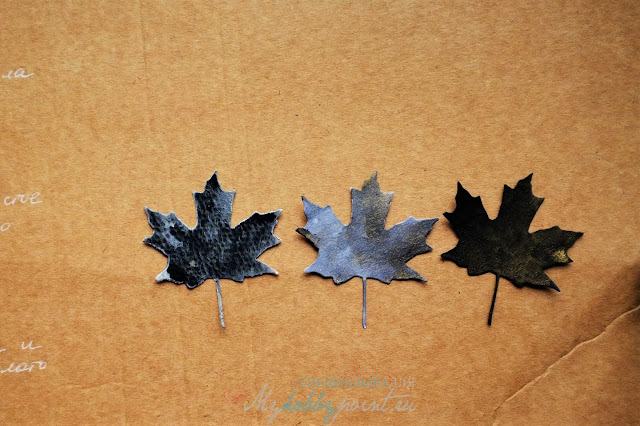Обложку обтянула мятой крафт-бумагой, загрунтовала её черным грунтом, вклеила туда настоящий листик, а потом покрыла обложку спреями Чернила-спрей GOLD Золотистое вино